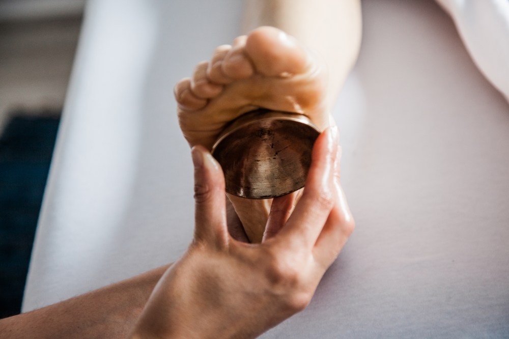 Le soin kansa vati est réalisé avec un bol kansu, du ghee (beurre clarifié), des huiles thérapeutiques et des huiles essentielles. Le soin équilibre les doshas vata (air), pitta (feu) et kapha (terre). En touchant aux zones réflexes des pieds et du corps, ce soin travaille comme la réflexologie. Il réactive la circulation de l’énergie vitale essentielle au bon fonctionnement de l’organisme et nettoie le métabolisme.